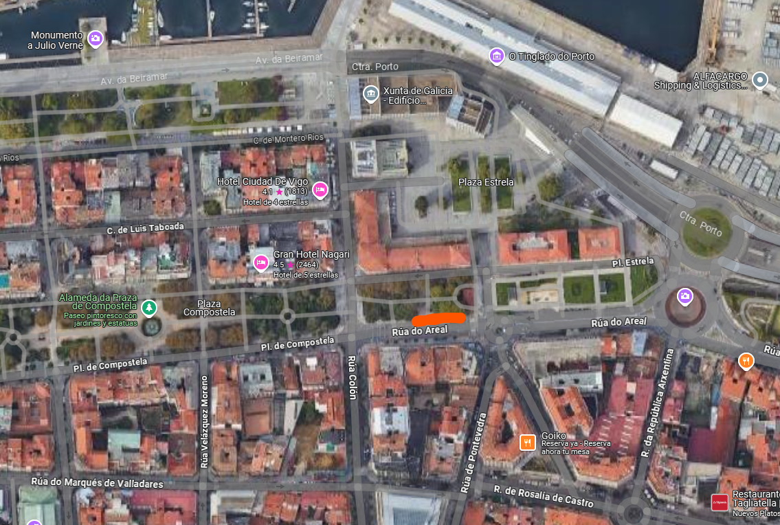 Los autobuses saldrán de la Plaza de Compostela a las 12:00 (desde la zona en rojo de la foto). El Punto de Encuentro es el siguiente: